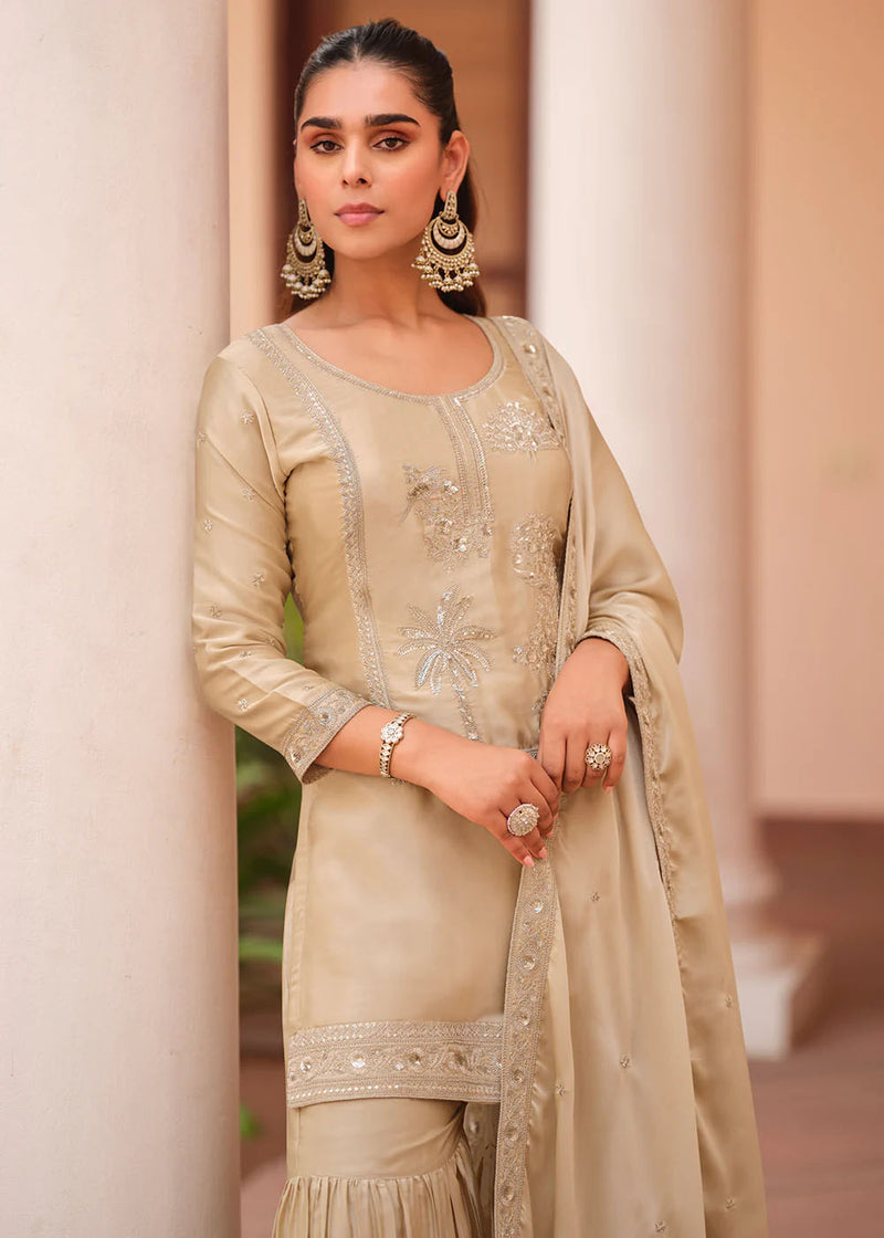 Designer Champagne Gold Silk Satin Embroidered Gharara Set