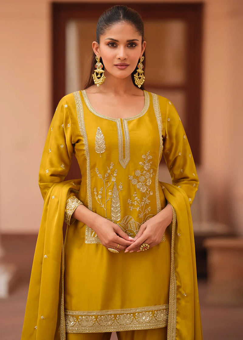 Designer Mustard Yellow Silk Satin Embroidered Gharara Set