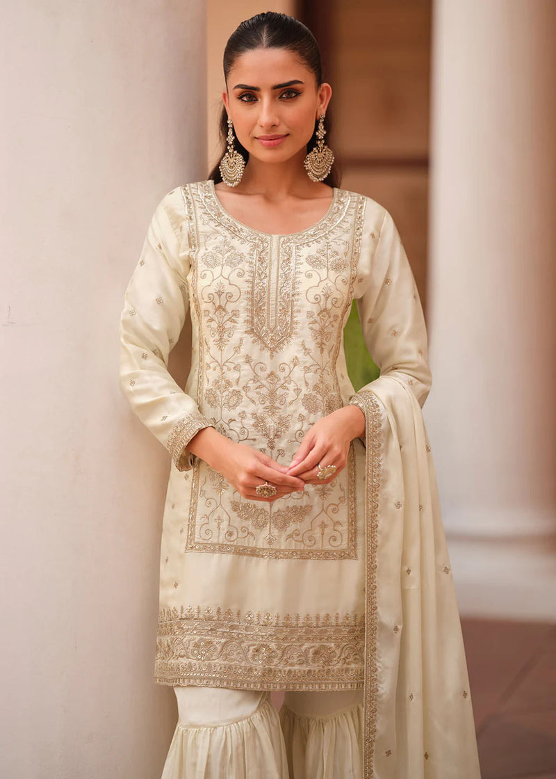 Designer Ivory Silk Satin Embroidered Gharara Set