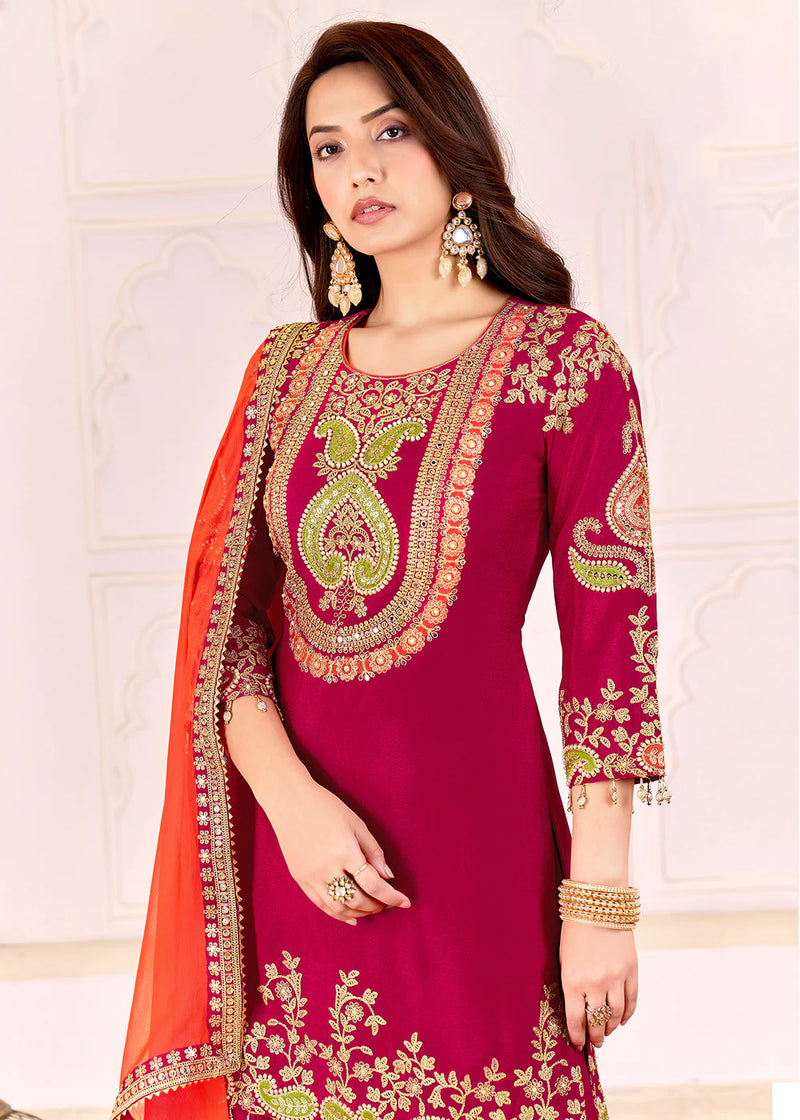 Luxury Deep Maroon Chinnon Embroidered Palazzo Set