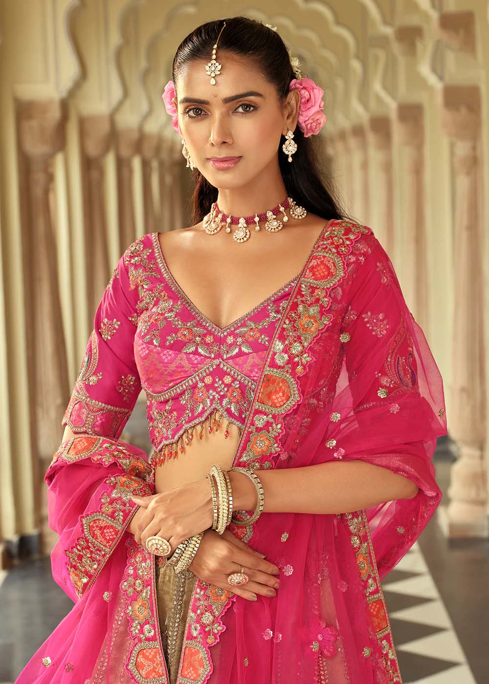 The lehenga features a voluminous flair and a meticulously embroidered blouse with traditional latkan accents, while the sheer net dupatta adds an ethereal touch with its elaborate embroidery. Whether you're the bride, a bridesmaid, or an honored guest, this lehenga choli ensures you radiate elegance and grace.