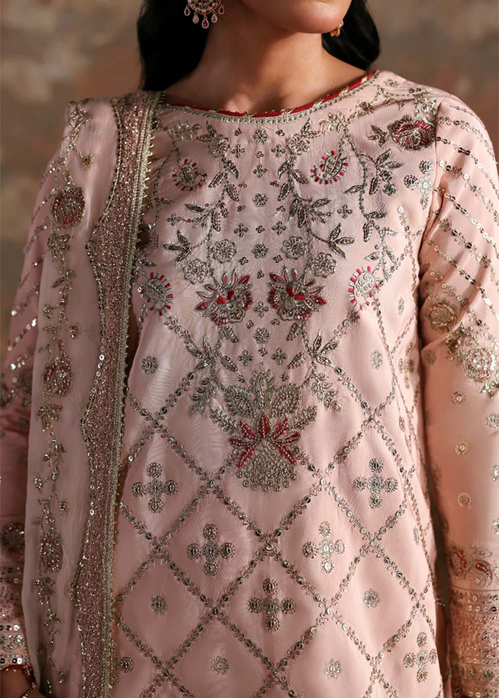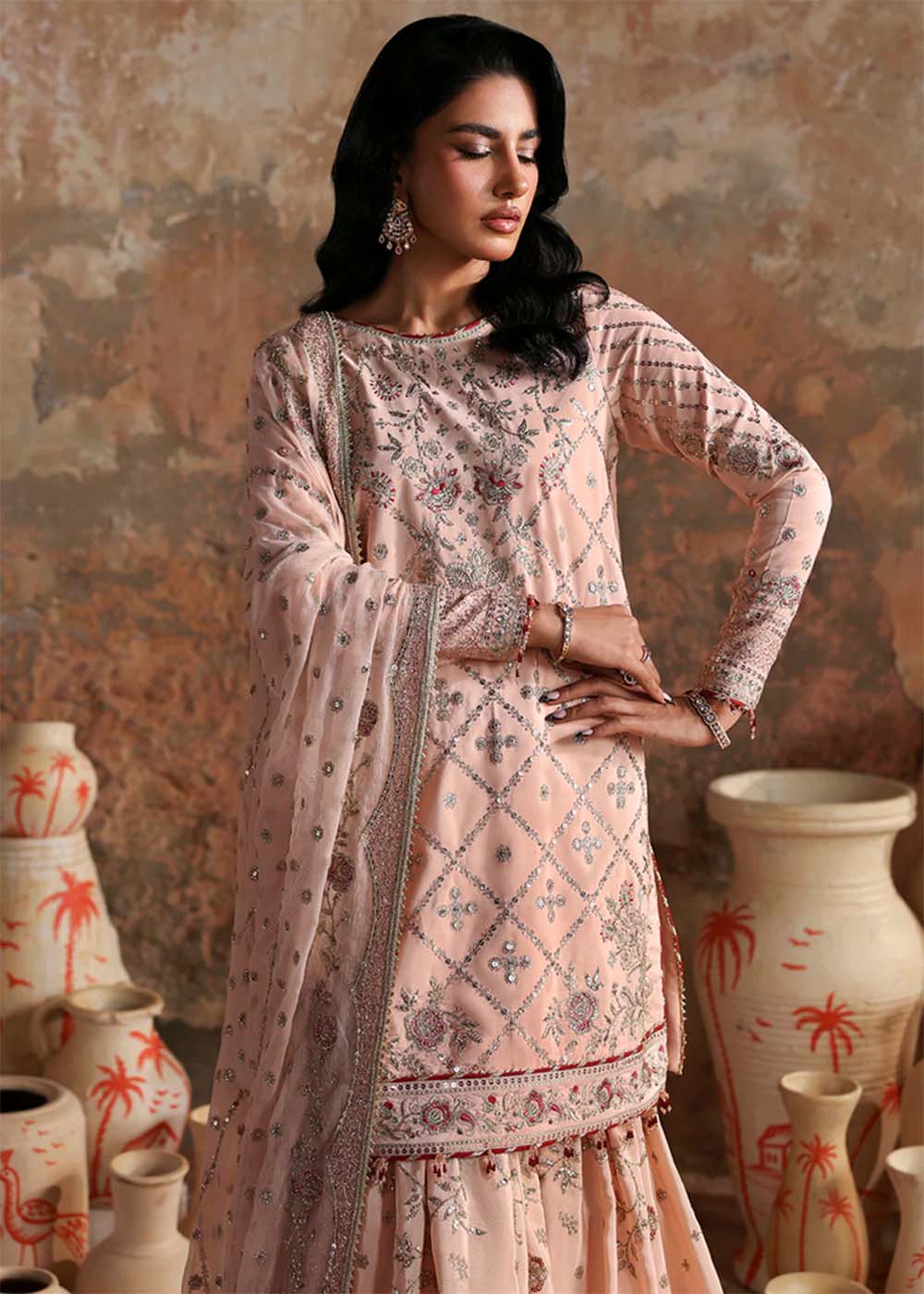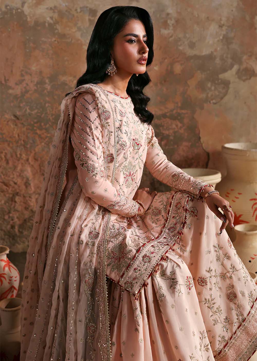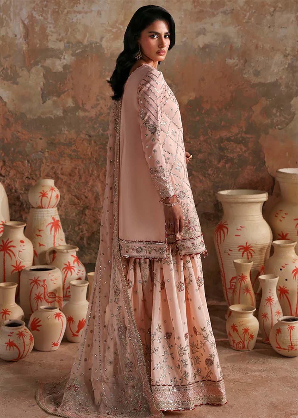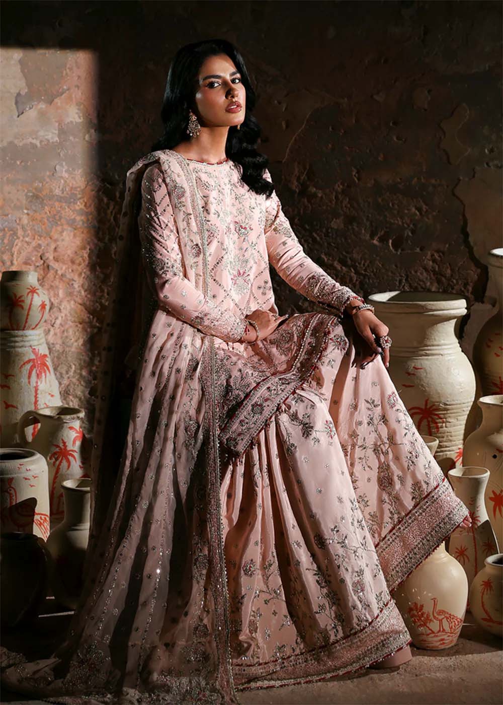Nazneen embodies delicate elegance in a serene blush pink—a luxurious gharara set featuring exquisite embroidery and graceful borders. This Emaan Adeel creation combines premium raw silk with intricate craftsmanship, offering timeless sophistication for weddings and festive celebrations.
